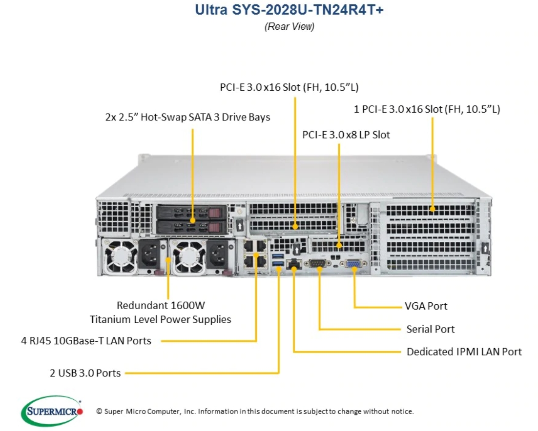 | Интерфейсы | 6x SATA3, 4x SAS3, 24x NVMe, 2x RJ45 (удаленное управление IPMI), 4x 10GBase-T LAN ports, 2х USB 3.0 (сзади), 2х USB 3.0 (спереди), 1х USB 3.0 (Type A), 1x VGA, 2 SuperDOM |