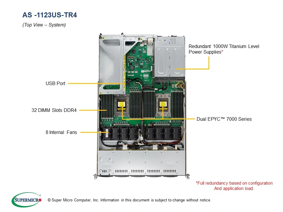 Dual AMD EPYC™ 7001/7002* Series Processors (*AMD EPYC 7002 series drop-in support requires board revision 2.x), 32 DIMM slots DDR4, 10 hot-swap 3.5" SATA3 by default or 8 NVMe (optional supported) or 8 SAS3 ports (SAS Add-on card is optional), 1000W
